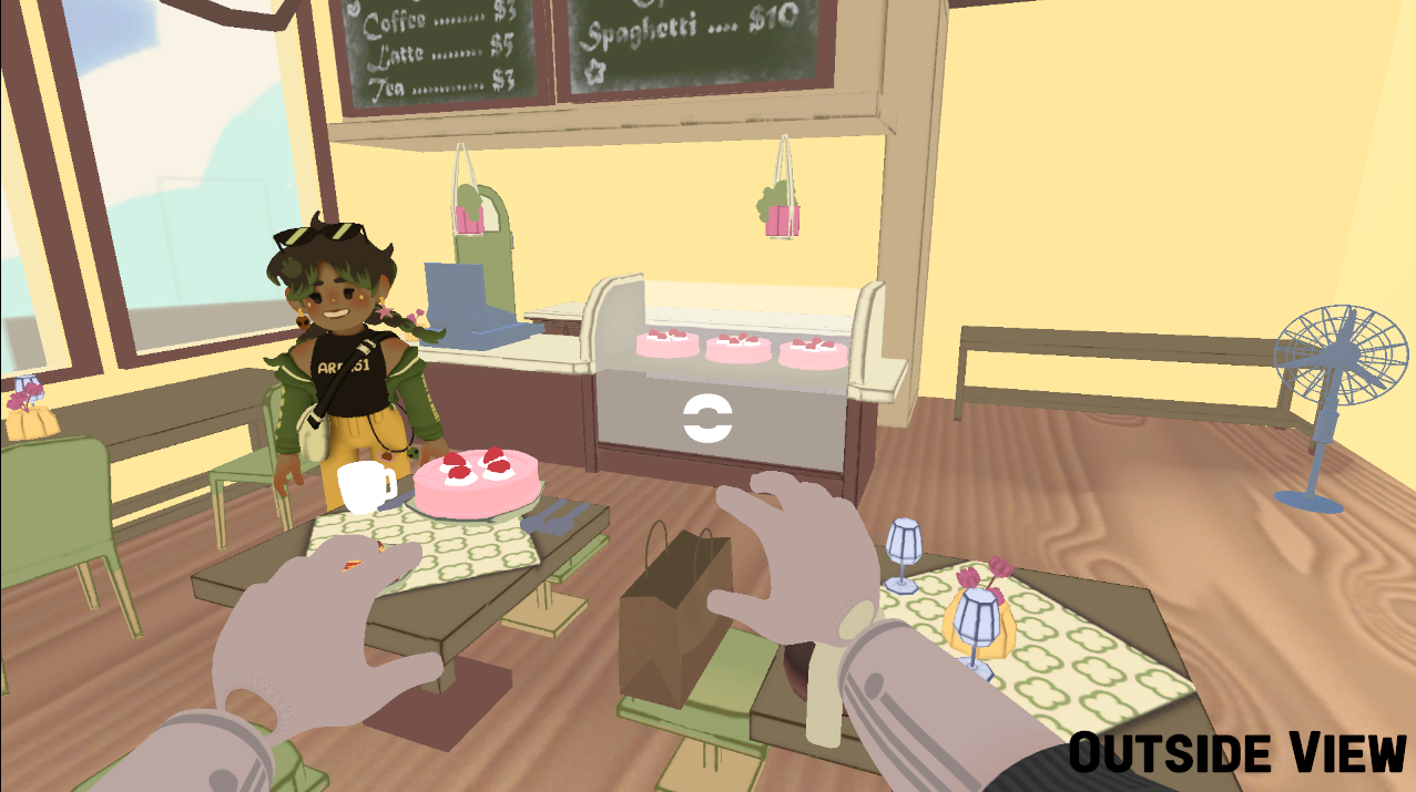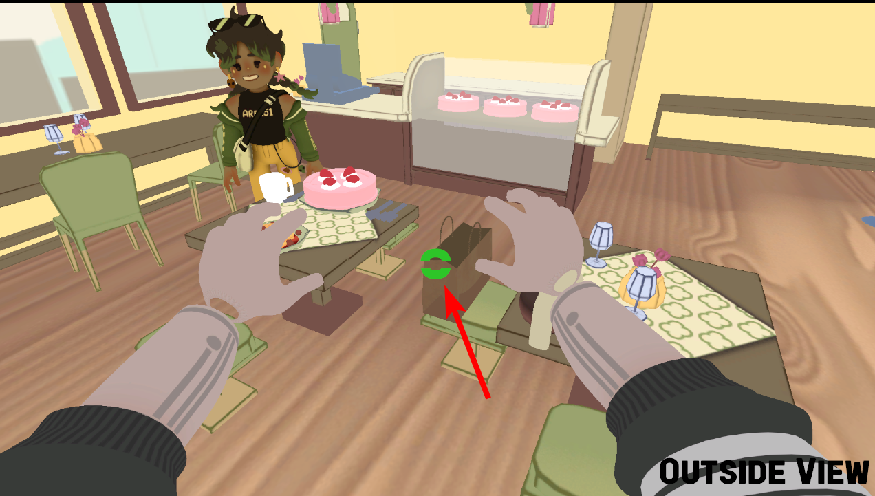 Arm Control Complexity - The complexity of arm controls was reduced with less rotation controls given to the player and the introduction of auto-aiming for the distance of the grapple arm launch. This auto aim is present on all interactable objects (such as the spaghetti plate and the bag to drop the spaghetti in) and causes the hand to launch to that distance if aimed at. This way, players did not need to control exactly how far to launch the arm to if they were already looking at an object of interest.
